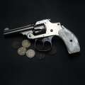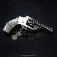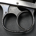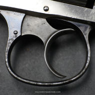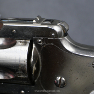 Les armes compactes, facilement dissimulables ou destinées à un port aisé en milieu urbain, connaissent dès la fin des années 1870 un succès considérable. La firme Smith & Wesson propose alors une large gamme de revolvers en calibres .32 et .38, en simple ou double action, avec ou sans chien apparent. La version sans chien visible (Hammerless) est particulièrement appréciée, car elle permet une sortie rapide de l’arme sans risque d’accrochage du chien dans les vêtements. Notre exemplaire appartient au premier modèle, communément appelé « Lemon Squeezer », fabriqué à partir de 1888 et produit à plus de 90 000 exemplaires. Il s’agit aujourd’hui d’un grand classique des revolvers de collection à double action à poudre noire.