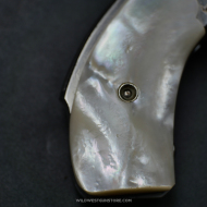 Sur le plan mécanique, le fonctionnement est irréprochable, avec une double action fluide et régulière. Le barillet, d’une capacité de cinq coups, est chambré en calibre .32 S&W. Le canon de 3 pouces présente un intérieur miroir sans défauts avec de belles rayures. Les plaquettes en nacre, en excellent état, offrent une harmonie esthétique remarquable avec l’ensemble du revolver.