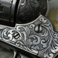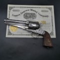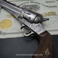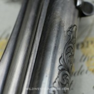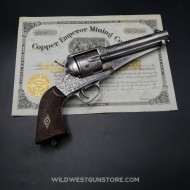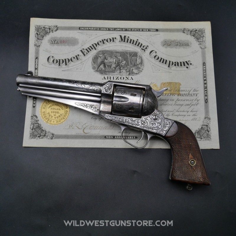 Le revolver Remington modèle 1875 est produit de 1875 à 1888. Il s’agit pour cette marque de concurrencer Colt et Smith et Wesson avec un modèle de revolver cartouches métalliques de calibre puissant. Premièrement fabriqué en calibres 44 Remington et 44Wcf, des petites fabrications en calibre 45 sont aussi proposées et donne une plus-value supplémentaire. Il n’y a pas de registre comme Colt pour savoir si une arme est gravée en usine ou par un armurier, les motifs ‘Scroll’ étant ceux en général fait en usine. Ce modèle est principalement proposé en canon de 7’’1/2, le canon en longueur de 5’’1/2 en fait une pièce d’autant plus rare. La production totale de cette rare arme de collection Remington est de 30 à 40.000 exemplaires.