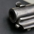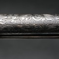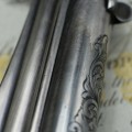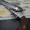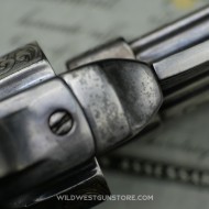 C’est avec grand plaisir que nous présentons cette rarissime arme de collection. Tout d’abord la configuration de ce remarquable revolver Remington 1875 qui cumule la rareté d'un calibre 45 Colt et d'un canon de longueur de 5’’1/2 d’origine. De plus cette version est gravée soit anciennement et probablement d’usine. Le nickelage est très largement présent sur l’arme et les parties ‘usées’ confirment l’authenticité de cette arme. On retrouve cette usure notamment sur le bout du canon qui prouve sa longueur d’origine. Des traces de poudre sont visibles en sortie de barillet et recouvre la gravure ce qui confirme le côté ancien de celle-ci. La partie mécanique de cette arme est en très bon état de fonctionnement avec un jeu d’usage. Le canon de longueur 5’’1/2 et de calibre 45 montre des signes d’utilisation. Les plaquettes sont d’une belle présentation en bois ciselé. Ce rare revolver Remington dans sa présentation prestigieuse sera une pièce majeure dans une belle collection d’armes anciennes.